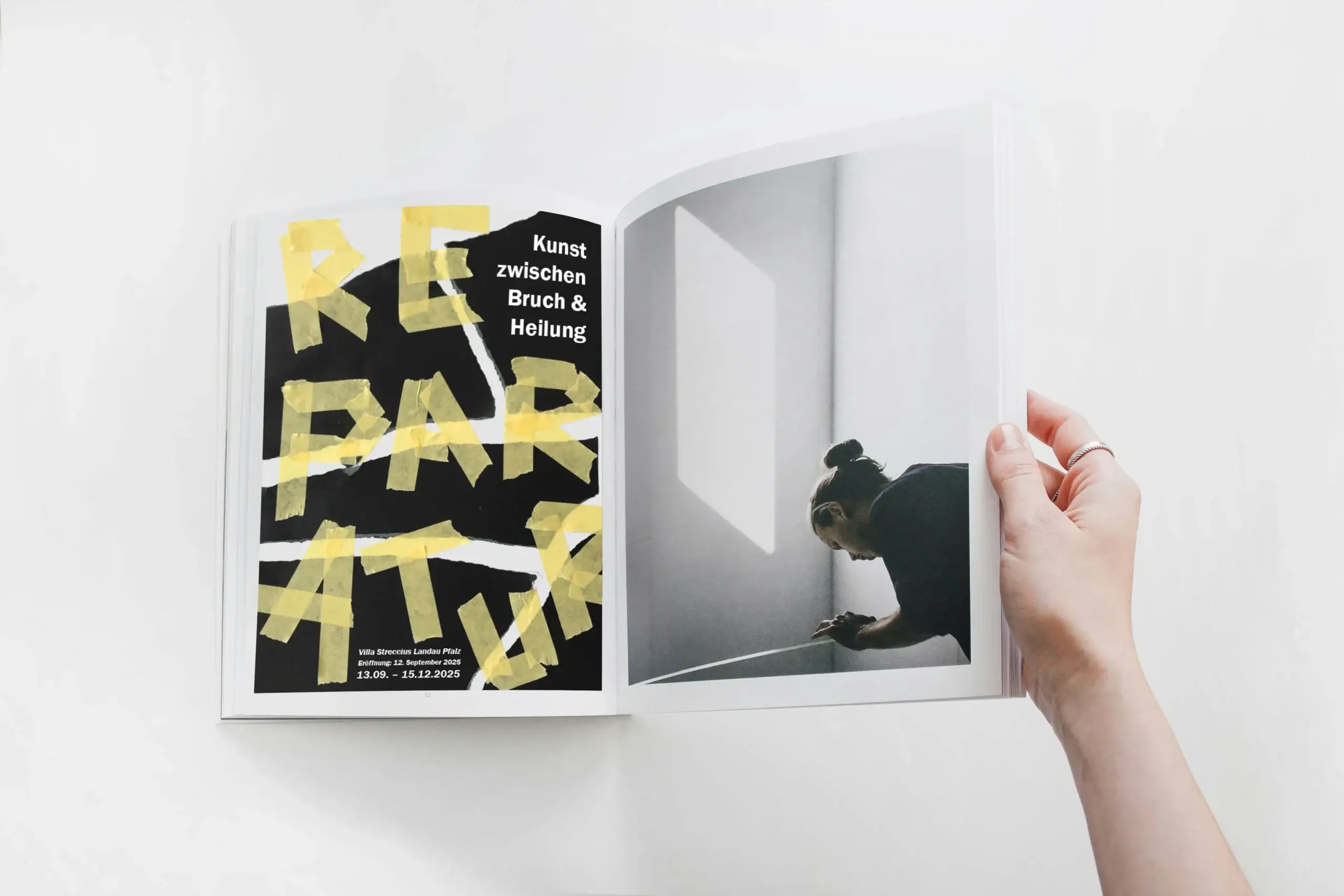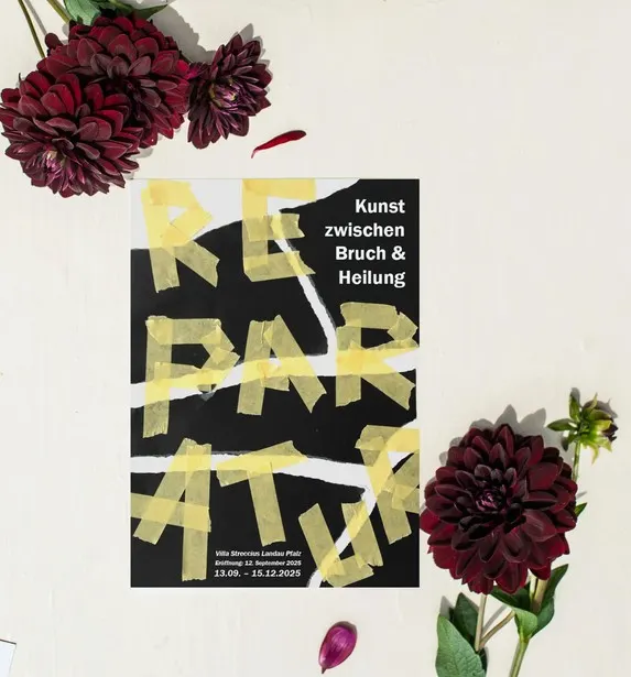Dieses Plakat ist eine Werbung für eine Kunstausstellung mit dem Titel „Reparatur – Kunst zwischen Bruch & Heilung“. Das Design ist mutig, roh und ausdrucksstark. Rau gezerrissene Kanten, starker Schwarz-Weiß-Kontrast und gelbe Klebeband-Typografie spiegeln die Themen von Schaden und Reparatur wider.
