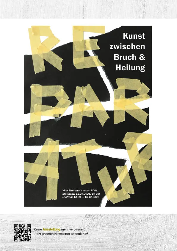 Der Schwarz-Weiß-Hintergrund bildet einen starken Kontrast zur gelben Klebeband-Typografie und erzeugt eine visuelle Spannung, die das Thema der Ausstellung aufgreift.