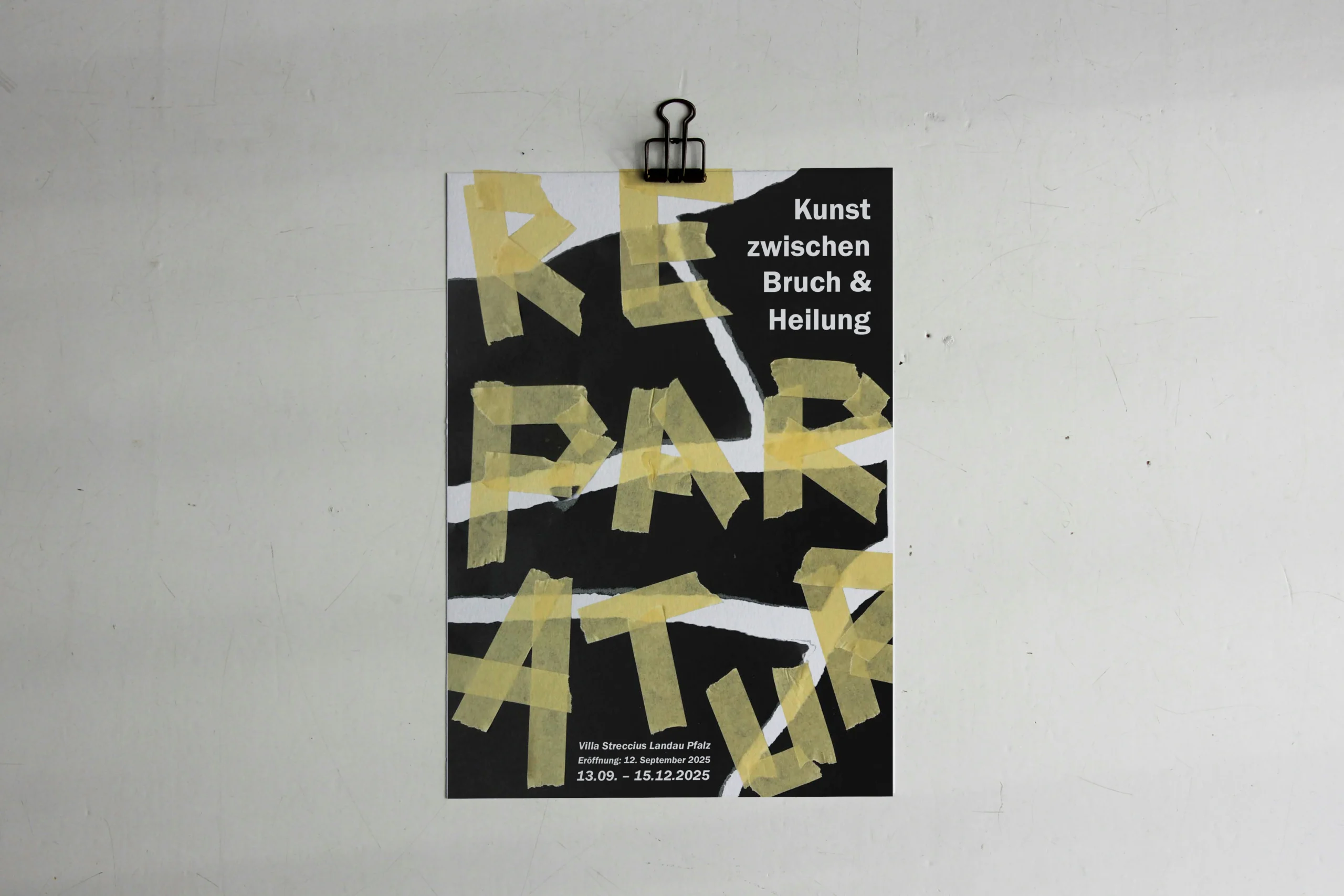 Das Plakat behandelt das Thema „Reparatur“ und erforscht die Spannung zwischen Zerstörung und Heilung. Dies wird durch ein fragmentiertes, zerrissenes Layout visualisiert und mit “gebleter” Typografie wieder zusammengesetzt – wobei das Klebeband als Schrift eingesetzt wird.