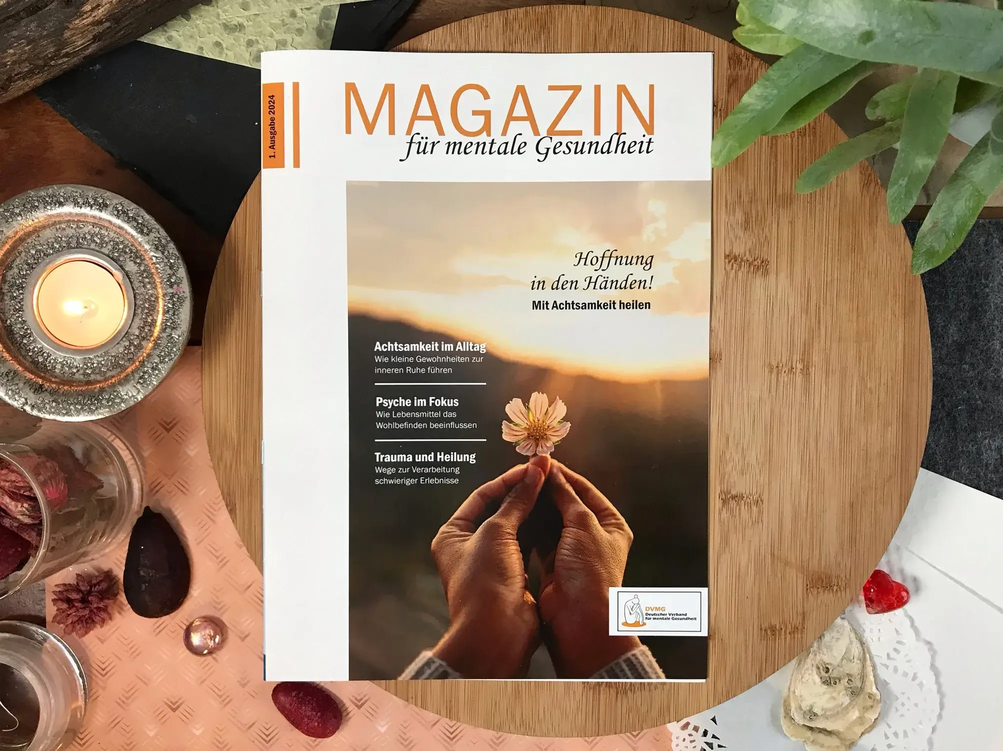 In diesem Beispiel zeige ich mein eigenes fotografiertes Mockup für ein Gesundheitsmagazin. Die Komposition an sich ist visuell ansprechend und sorgfältig gestaltet – aber hier ist der entscheidende Punkt: Das Magazin muss im Mittelpunkt stehen.