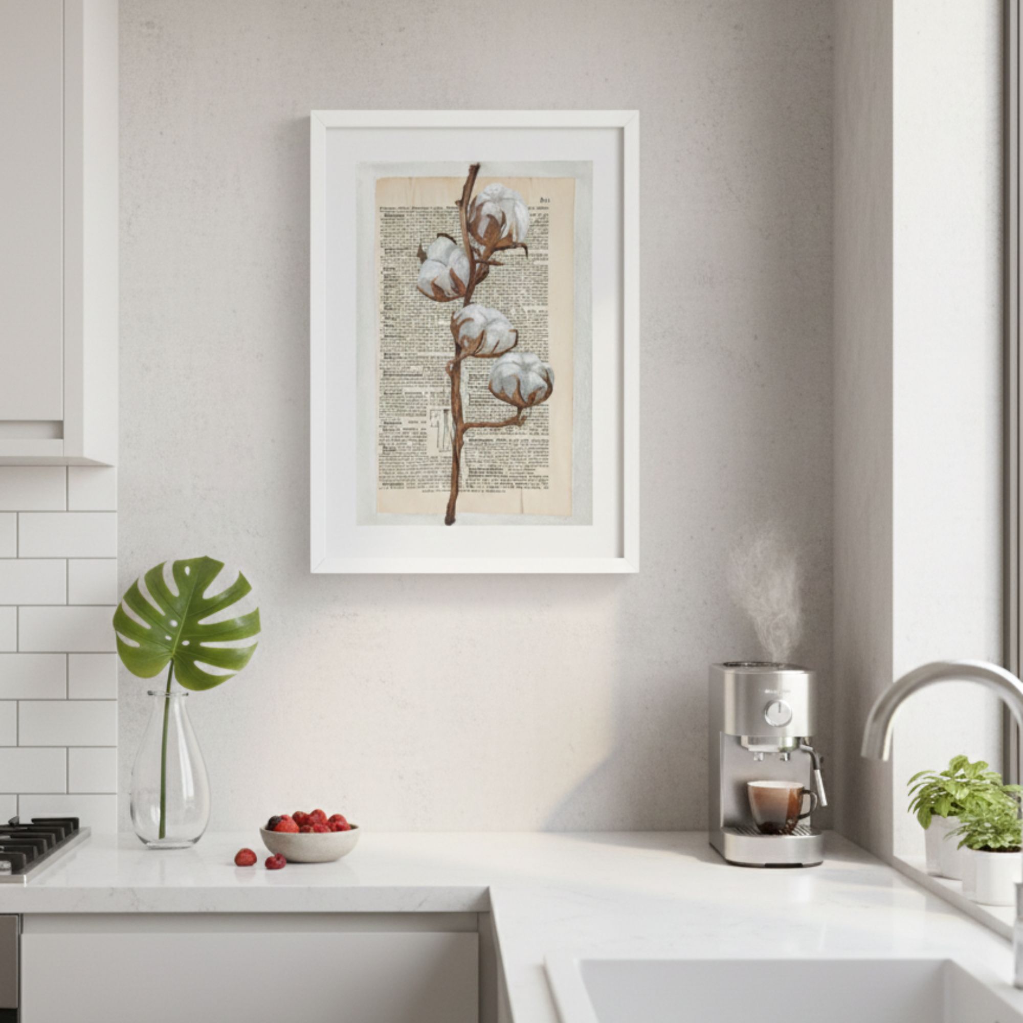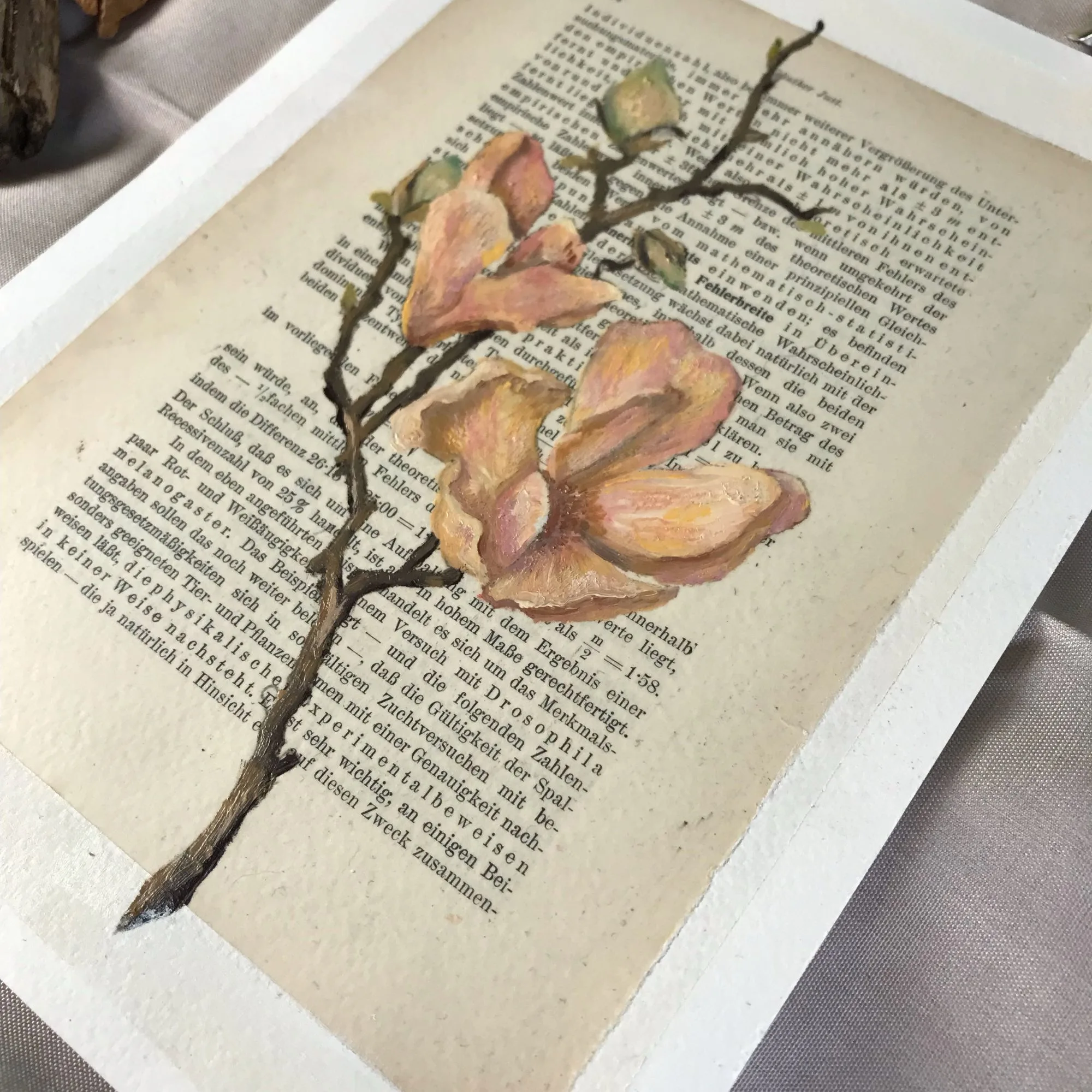 Der Reiz dieser Auftragskunst liegt im Kontrast der Zeiten. Stell dir vor, wie die feinen, vergilbten Fasern des Papiers – die bereits Jahrzehnte an Geschichte atmen – auf die frische, lebendige Kraft moderner Ölfarben treffen. Diese Vintage Botanical Art ist ein Dialog zwischen dem geschriebenen Wort der Vergangenheit und der visuellen Schönheit der Natur.