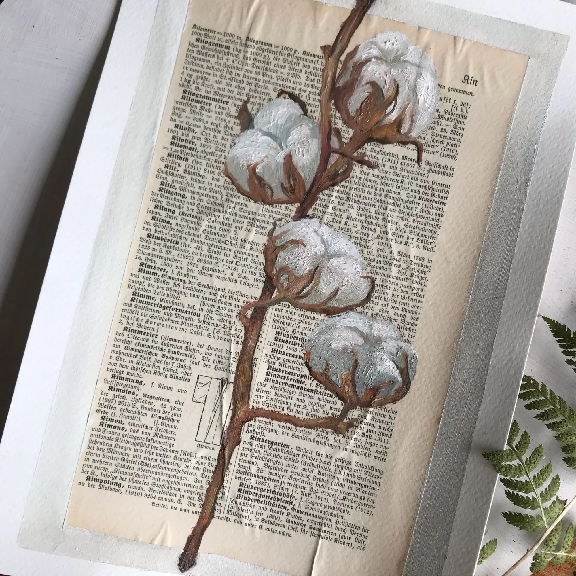 Antike Buchseite: Als Leinwand dient eine echte, vintage Buchseite mit authentischer Patina. Der Kontrast zwischen der pastosen, frischen Ölfarbe und dem historischen Papier macht jedes Stück zu einem haptischen Erlebnis.