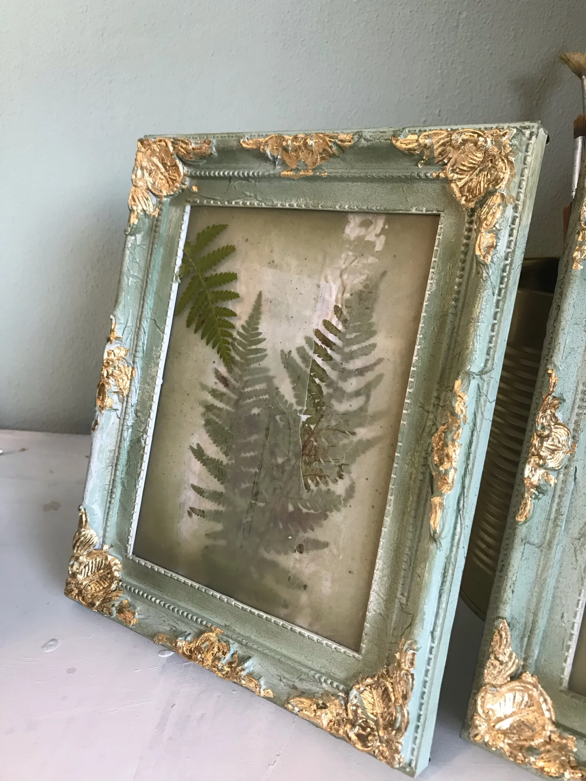• Makel als Highlight: Anstatt Spuren der Zeit zu kaschieren, hebe ich sie hervor. Ein Knick im Papier oder die rissige Struktur des Rahmens werden durch Blattgold veredelt.