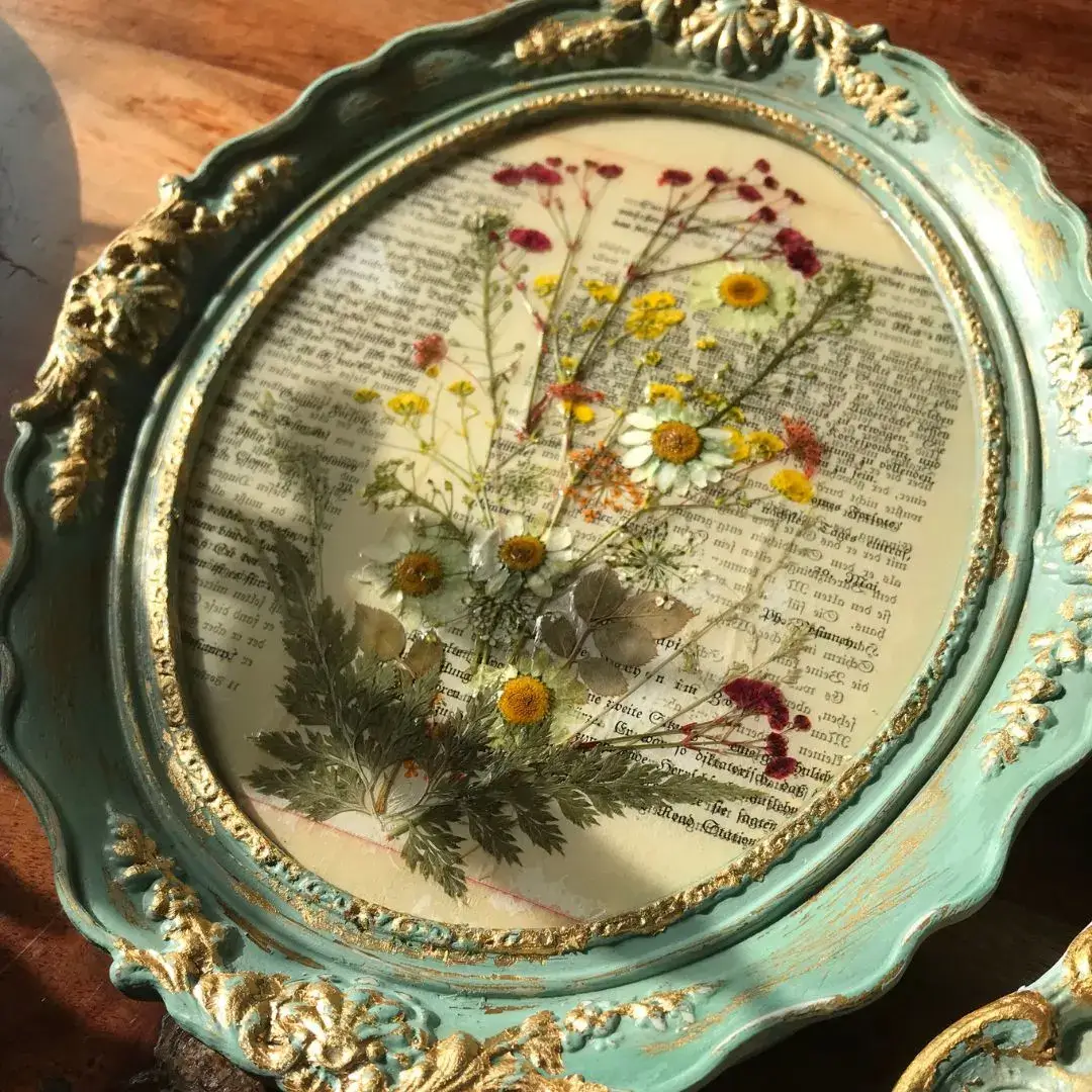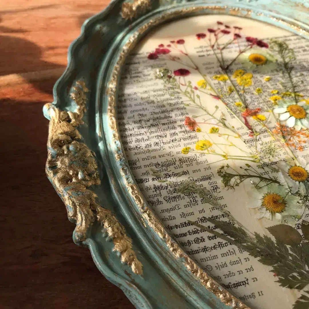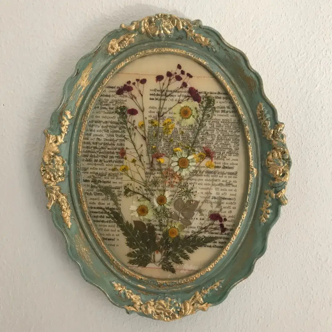 - Nachhaltigkeit: Upcycling eines antiken Rahmens und Verwendung historischer Buchseiten.