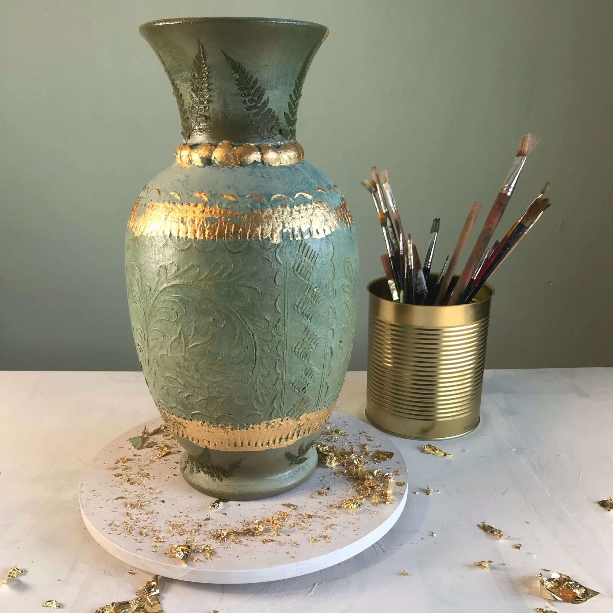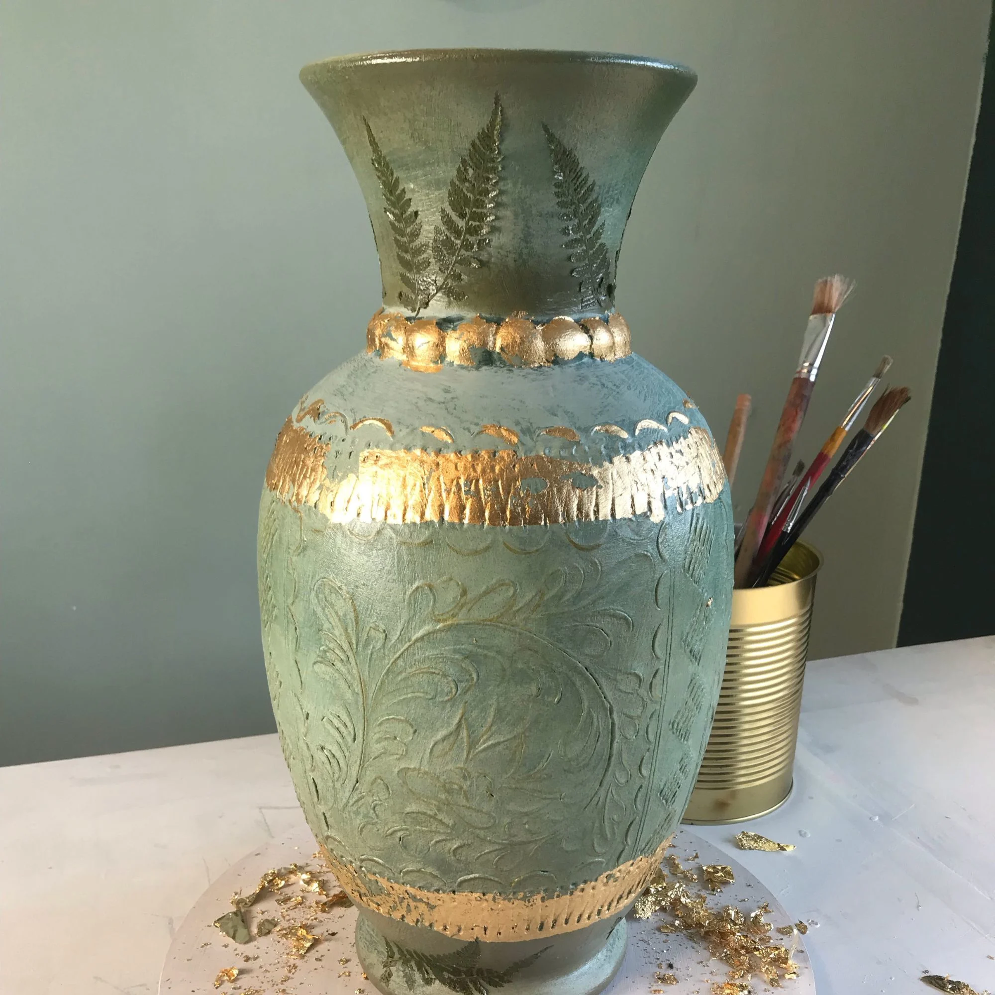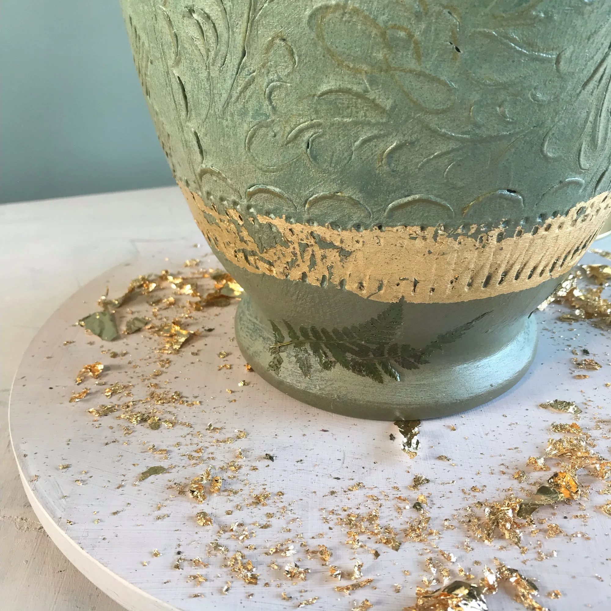 Materialien: Keramik, echtes Blattgold, Naturfarn