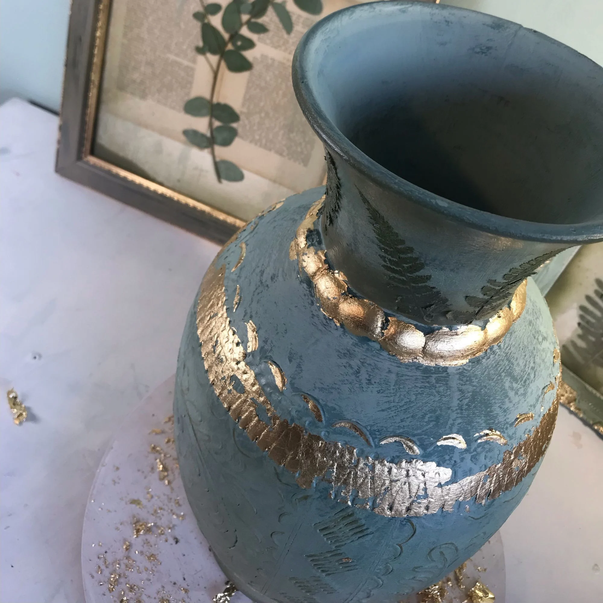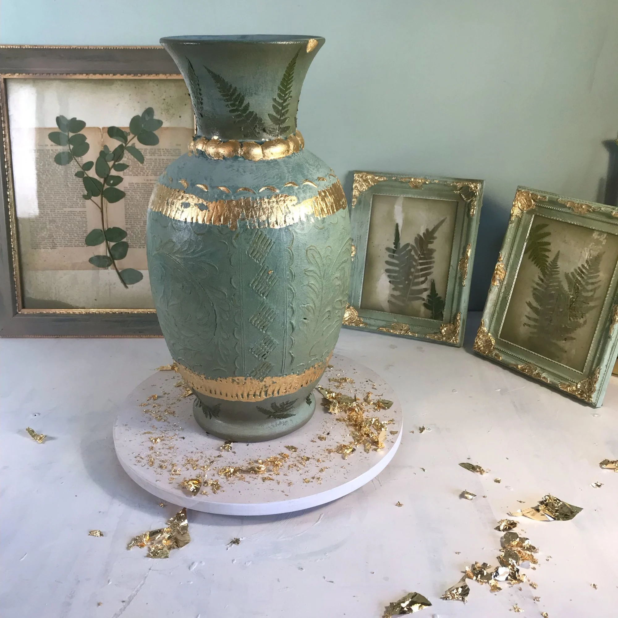 Lost Garden Ästhetik: Wie ein Relikt aus einem vergessenen Garten ist die Vase mit echtem, gepresstem Farn veredelt. Die botanischen Strukturen wirken wie in die Patina hineingewachsen und verstärken den Eindruck eines wiederentdeckten Schatzes.