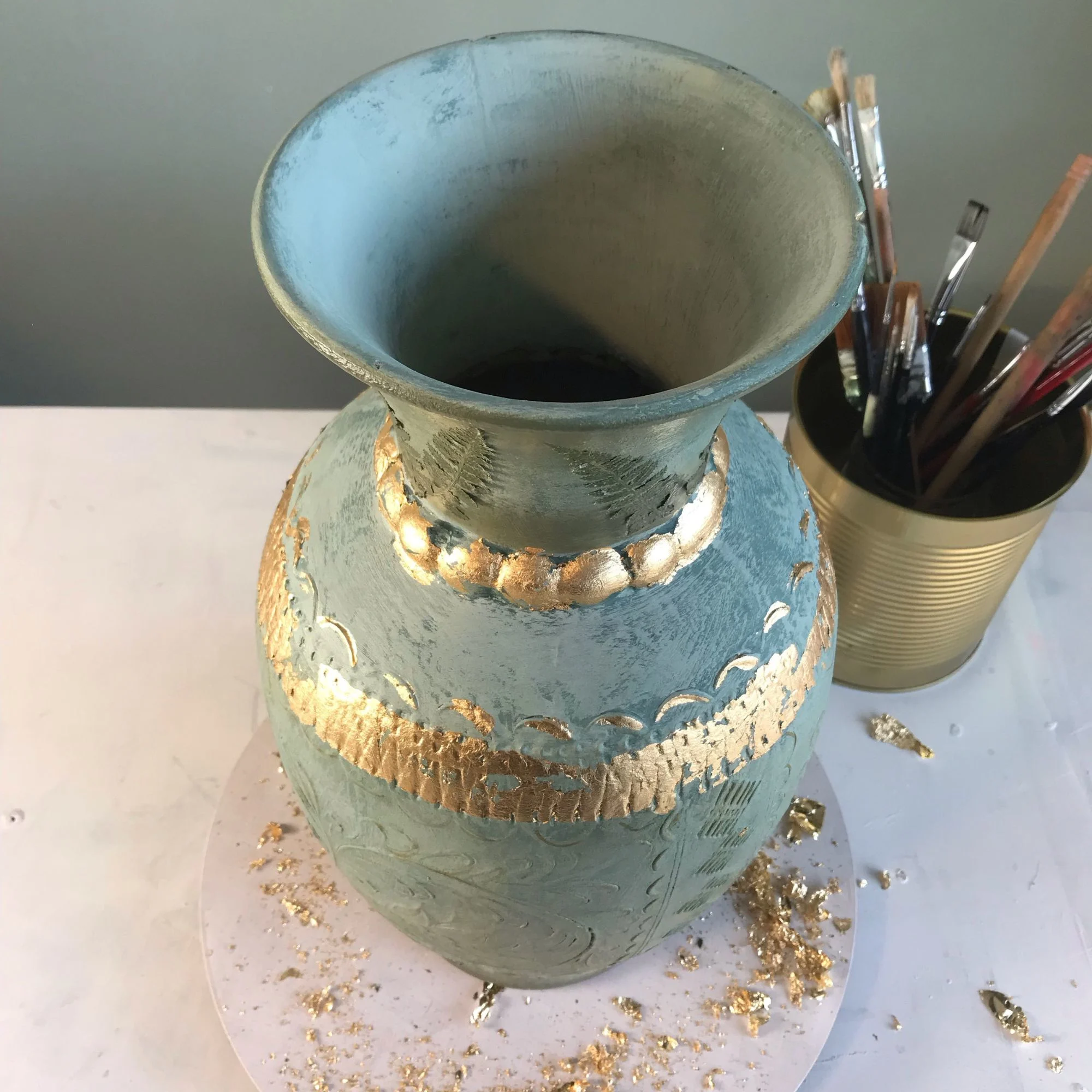 Echtes Blattgold als Kontrast: Die Veredelung mit echtem Blattgold setzt einen luxuriösen Bruch zur rustikalen Oberfläche. Das Gold legt sich in die Vertiefungen und betont die Geschichte des Objekts, anstatt sie zu überdecken.