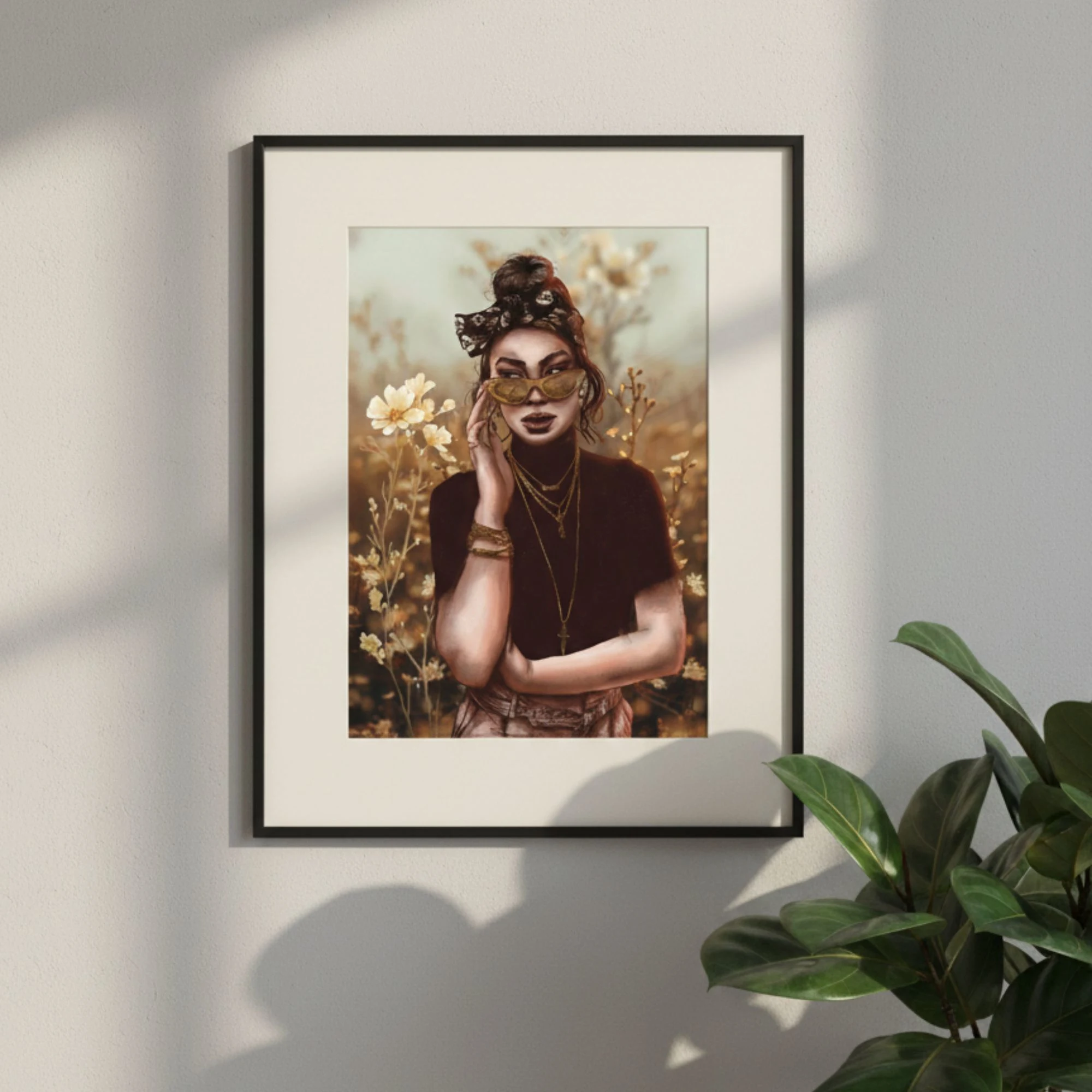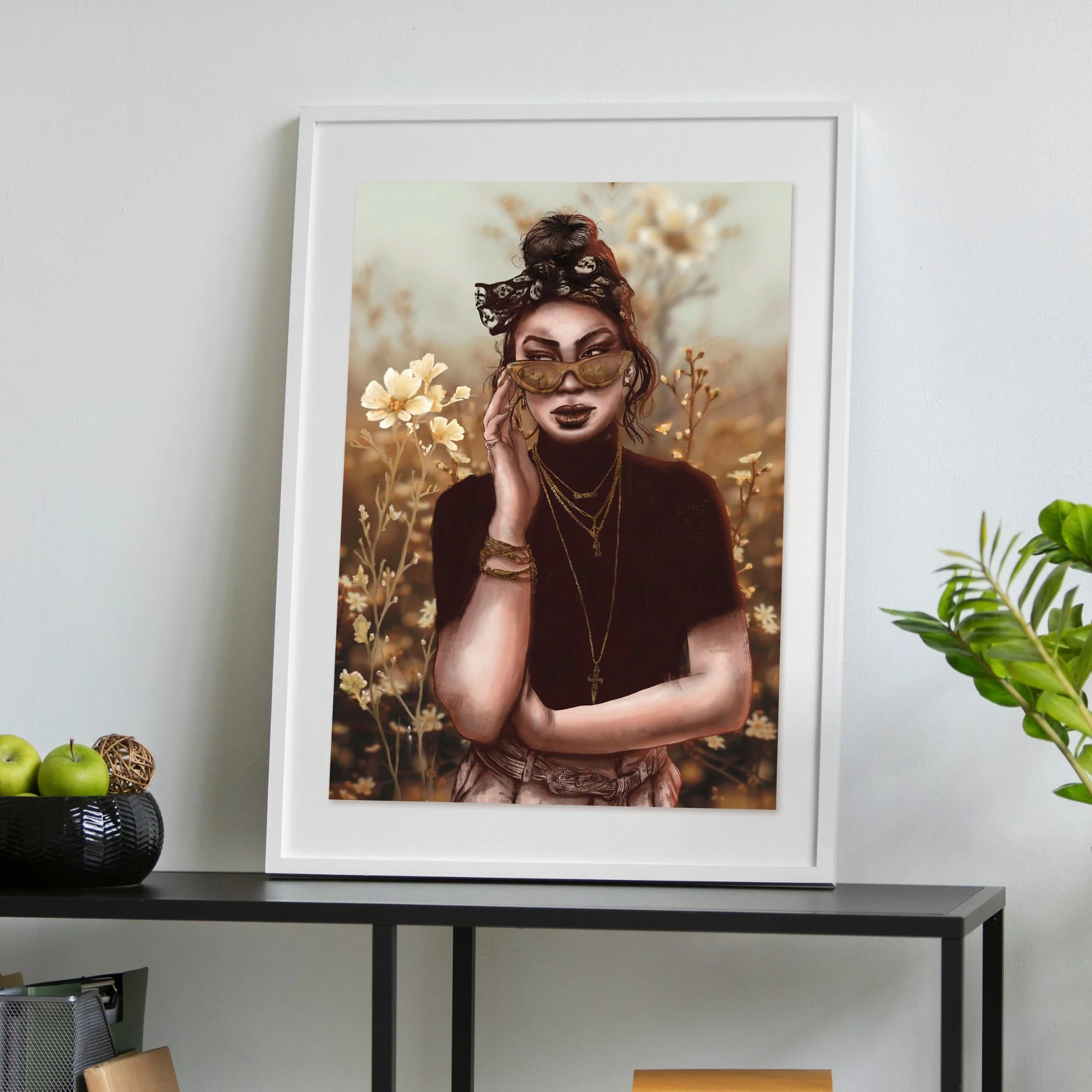 - Keywords: Porträt Frau Modern, Feminine Wandkunst, Eklektische Kunst, Magischer Realismus
