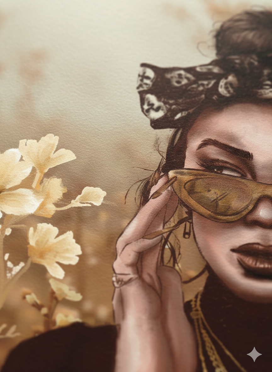 Gedruckt als Galerie-Edition auf nachhaltigem Hahnemühle Bamboo Papier, vereint diese Maximalismus Kunst höchste Ästhetik mit ökologischem Bewusstsein. Die edle, matte Haptik des Naturpapiers (90% Bambusfasern) unterstreicht die feinen Texturen des Porträts und sorgt für eine reflexionsfreie, authentische Bildwirkung.