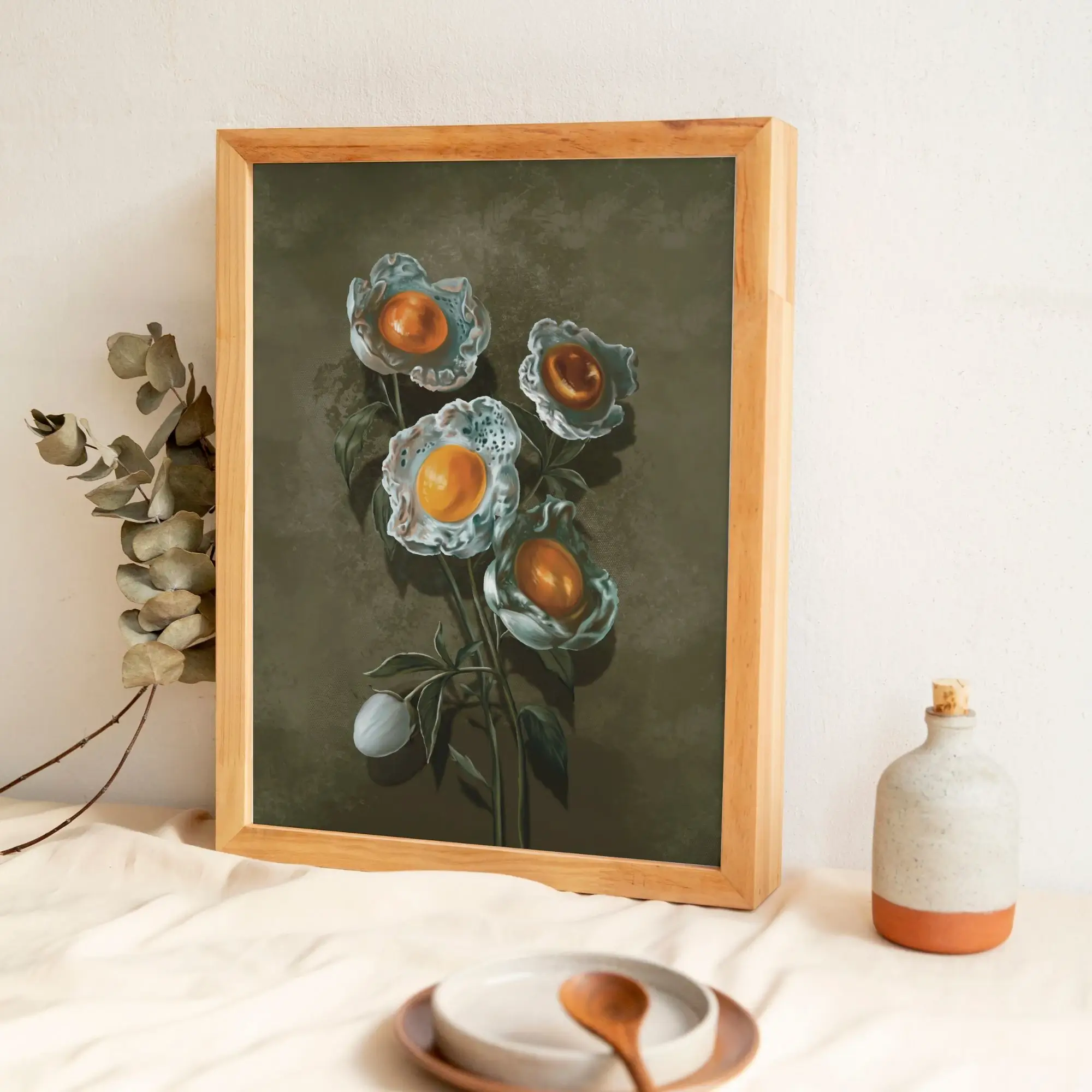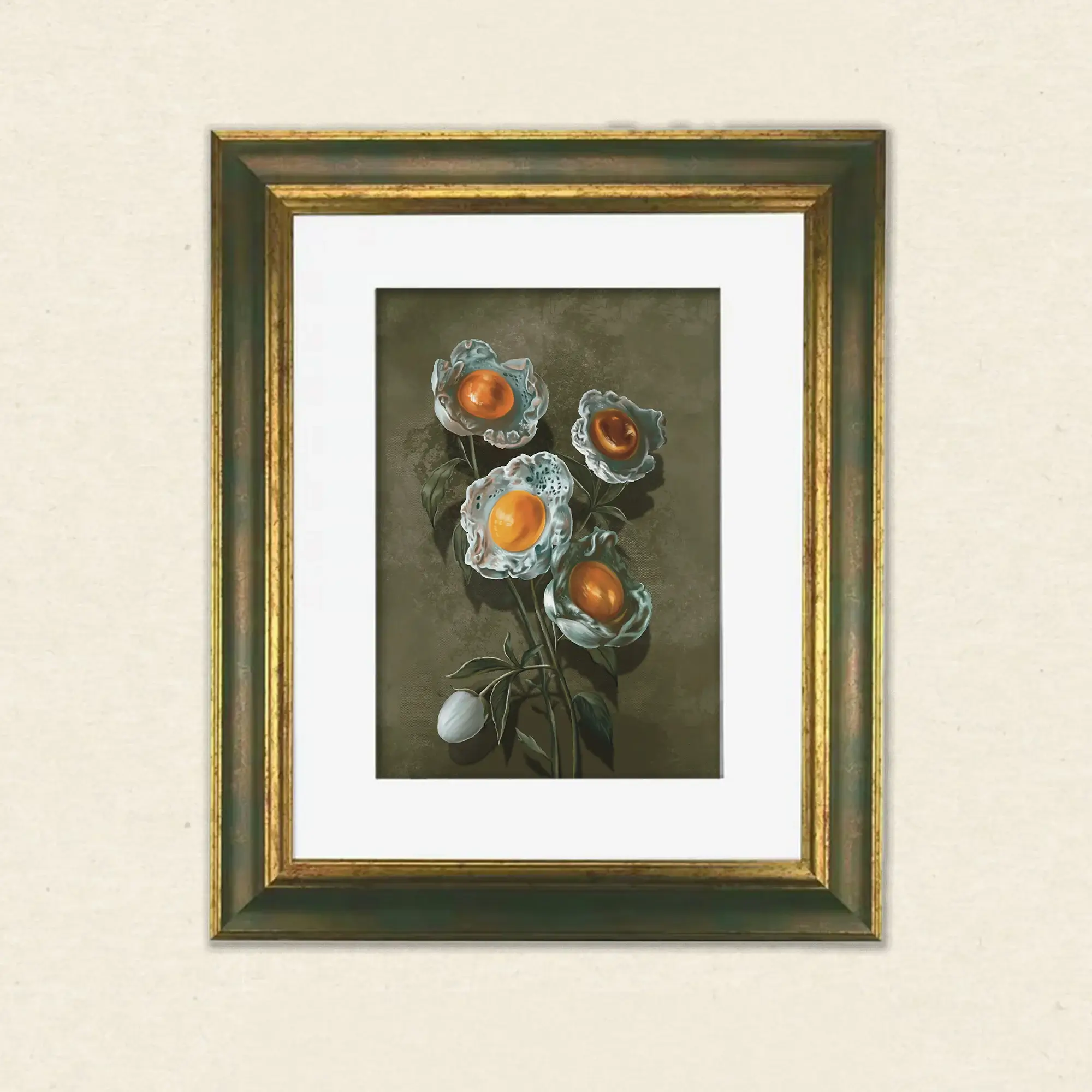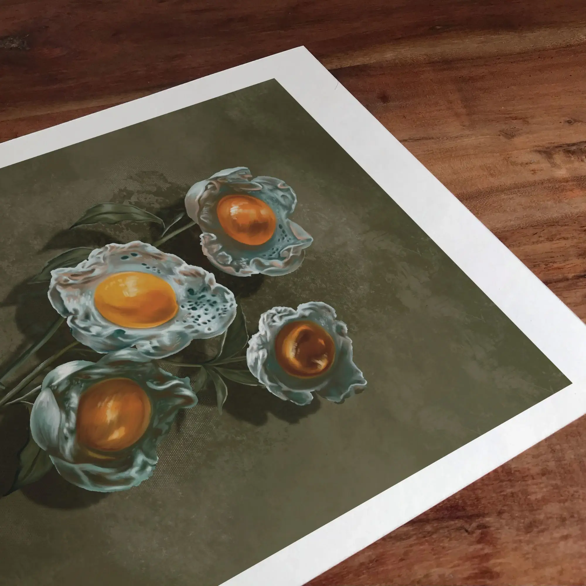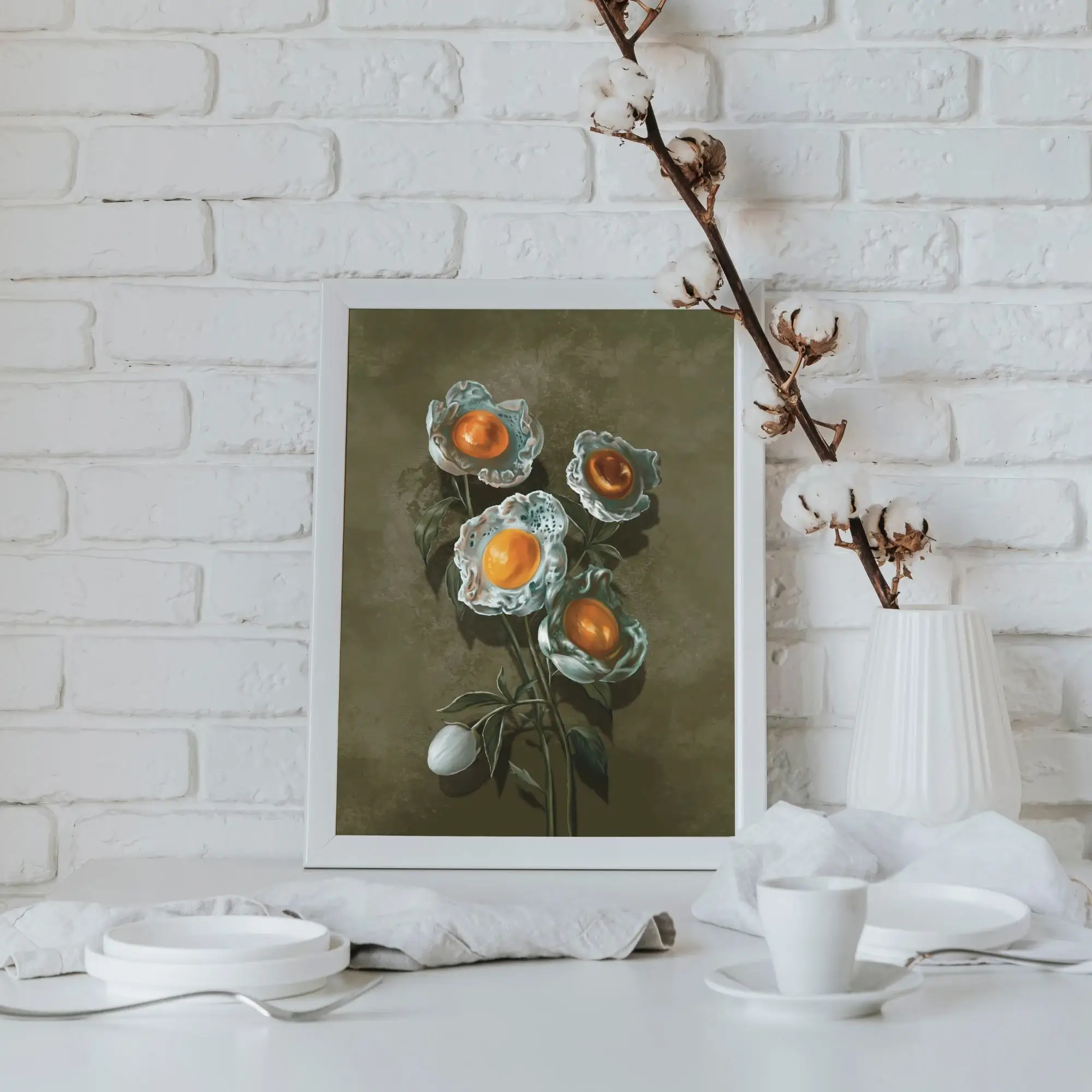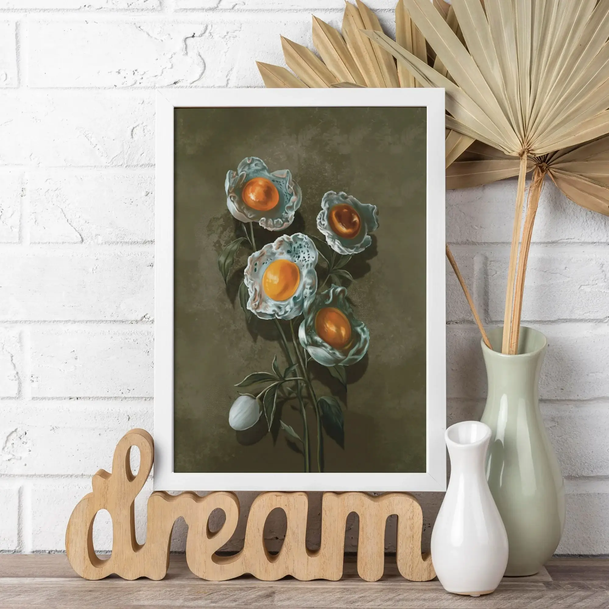 Du möchtest außergewöhnliche Surrealismus Bilder kaufen, die Humor und Eleganz vereinen? Dieses Kunstdruck interpretiert die klassische Botanik völlig neu. Dieses Werk besticht durch seine einzigartige Kombination aus zarten Pfingstrosen und surrealen Spiegelei-Blüten – ein echtes Statement-Piece für moderne Räume.